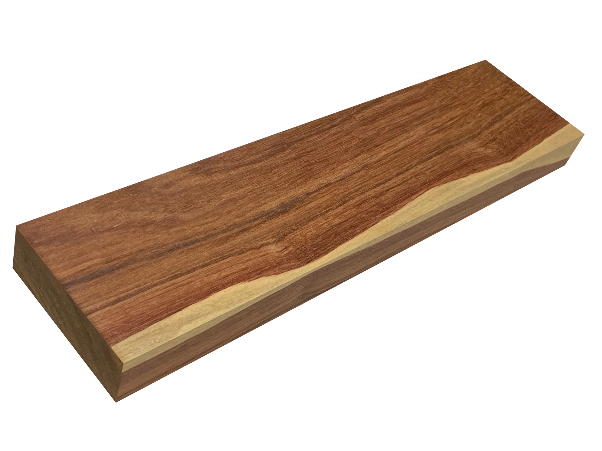 Heartwood ranging from reddish to purplish brown with distinct creamy sapwood.